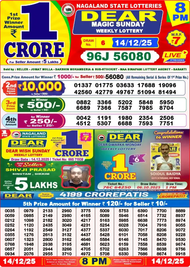नागालैंड राज्य लॉटरी परिणाम आज रात 8 बजे का ड्रा इस पेज पर रोजाना उपलब्ध है। नागालैंड स्टेट लॉटरी का रिजल्ट ऑनलाइन मुफ्त में देखें। नागालैंड स्टेट लॉटरी का रिजल्ट दिन में 3 बार घोषित किया जाता है, दोपहर 1:00 बजे नागालैंड स्टेट लॉटरी 6:00 बजे और शाम 8:00 बजे। इस पेज पर डियर हॉक, डियर ऑस्ट्रिच, डियर पैरट, डियर फ्लेमिंगो, डियर ईगल, डियर फाल्कन और डियर वल्चर के शाम के रिजल्ट ऑनलाइन देखें। शाम के ड्रा के लिए प्रत्येक का नाम किसी जानवर के नाम पर रखा गया है। आप दिए गए टेबल में ड्रा के नाम और दिन देख सकते हैं। नागालैंड स्टेट लॉटरी रिजल्ट आज दोपहर 1 बजे और नागालैंड स्टेट लॉटरी रिजल्ट आज शाम 6 बजे के नतीजे देखें|