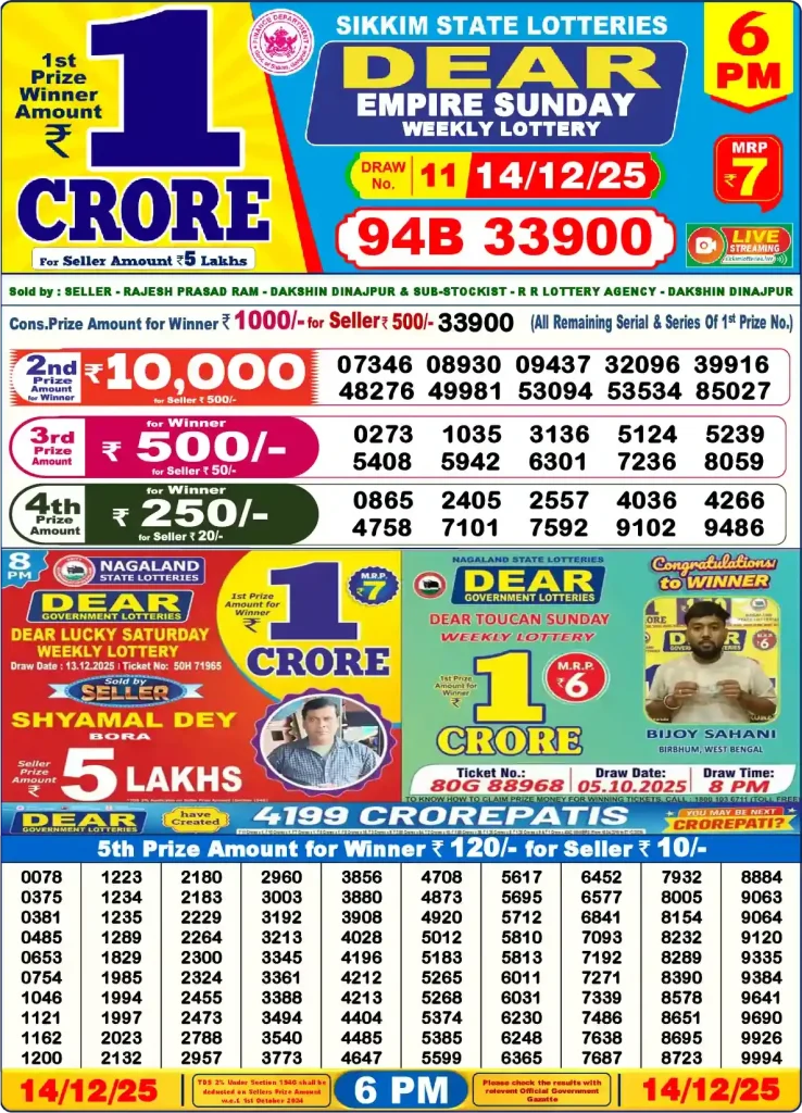 नागालैंड राज्य लॉटरी परिणाम आज शाम 6 बजे