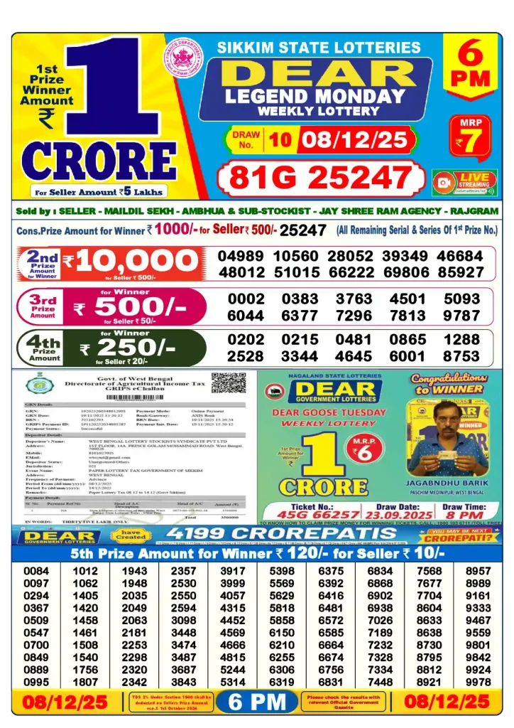 नागालैंड स्टेट लॉटरी संबाद कोई भी जीत सकता है। अलग-अलग विक्रेताओं से ऑनलाइन टिकट प्राप्त करें और सुनिश्चित करें कि वे भरोसेमंद हैं। आप नागालैंड राज्य प्राधिकरणों की आधिकारिक वेबसाइट से दावा प्रपत्र प्राप्त कर सकते हैं जो पूरी योजना का प्रबंधन करते हैं। हम आपके लॉटरी न जीतने के लिए ज़िम्मेदार नहीं हैं। हम सिर्फ़ आधिकारिक परिणाम प्रकाशित करते हैं। प्रतिभागियों को नागालैंड लॉटरी के नियमों का पालन करना चाहिए। आयकर अधिनियम, 1961 की धारा 194 बी के अनुसार, अगर विजेता की पुरस्कार राशि ₹10,000 से ज़्यादा है, तो उससे कर काटा जाएगा। वह टीडीएस ऑनलाइन काटा जाएगा और 30% होगा।