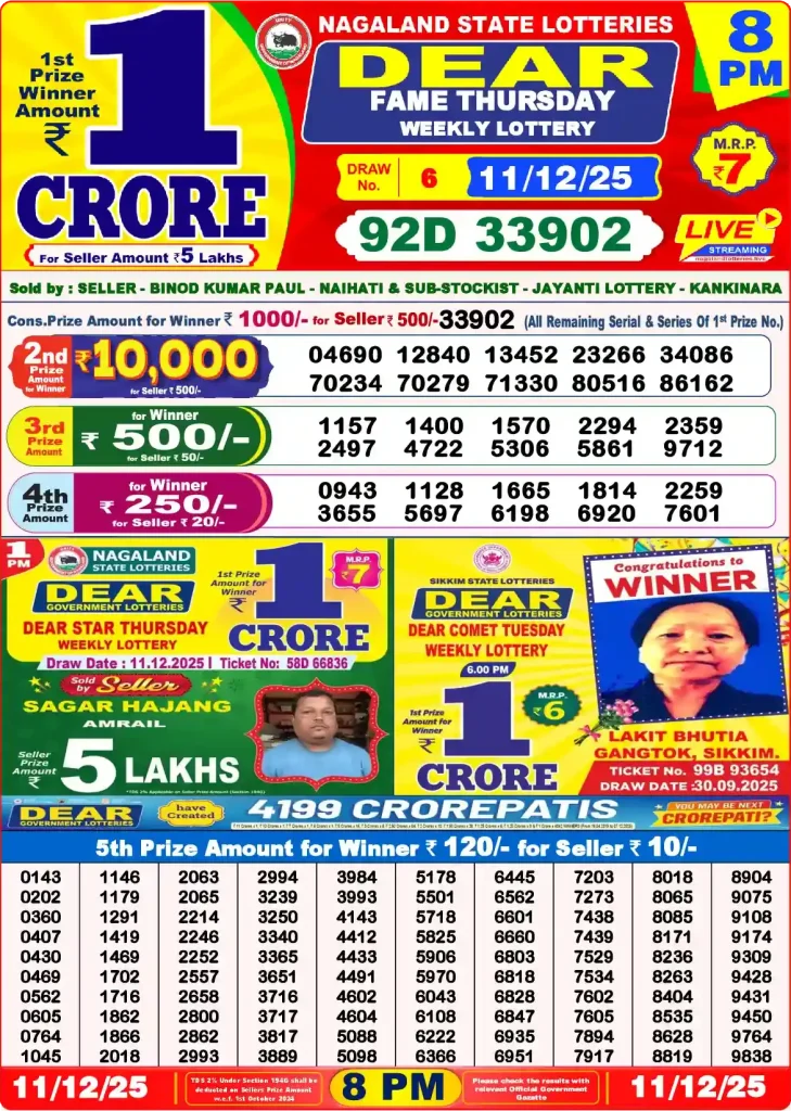 नागालैंड राज्य लॉटरी परिणाम आज रात 8 बजे का ड्रा इस पेज पर रोजाना उपलब्ध है। नागालैंड स्टेट लॉटरी का रिजल्ट ऑनलाइन मुफ्त में देखें। नागालैंड स्टेट लॉटरी का रिजल्ट दिन में 3 बार घोषित किया जाता है, दोपहर 1:00 बजे नागालैंड स्टेट लॉटरी 6:00 बजे और शाम 8:00 बजे। इस पेज पर डियर हॉक, डियर ऑस्ट्रिच, डियर पैरट, डियर फ्लेमिंगो, डियर ईगल, डियर फाल्कन और डियर वल्चर के शाम के रिजल्ट ऑनलाइन देखें। शाम के ड्रा के लिए प्रत्येक का नाम किसी जानवर के नाम पर रखा गया है। आप दिए गए टेबल में ड्रा के नाम और दिन देख सकते हैं। नागालैंड स्टेट लॉटरी रिजल्ट आज दोपहर 1 बजे और नागालैंड स्टेट लॉटरी रिजल्ट आज शाम 6 बजे के नतीजे देखें|